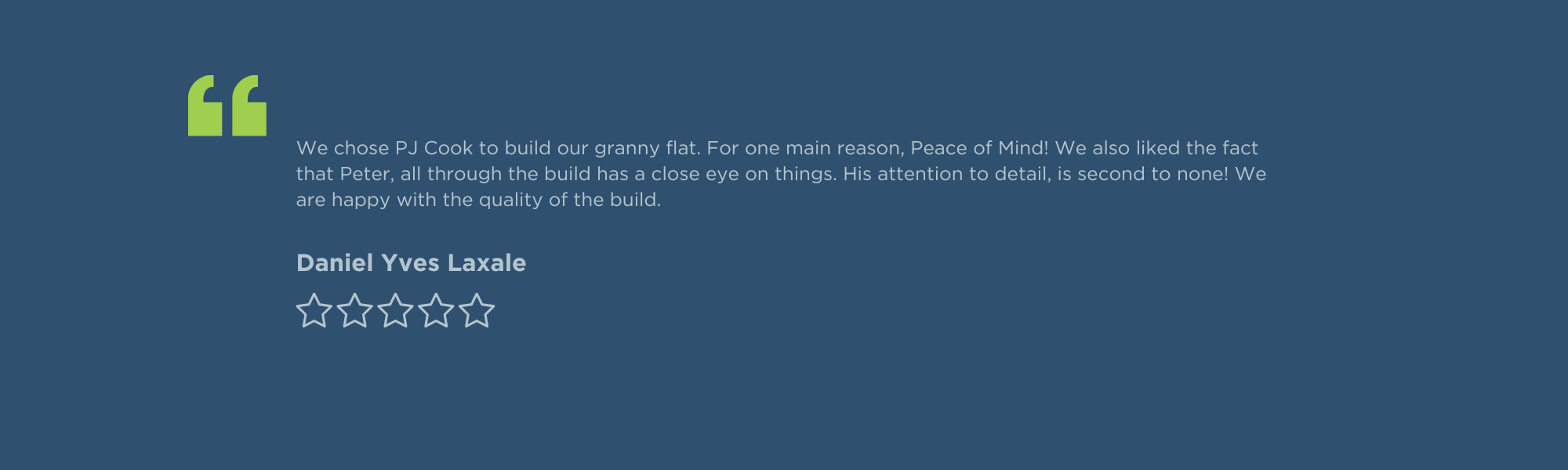 At P J Cook Building, we don’t just construct homes—we create exceptional living spaces tailored to your needs. Whether you’re planning a granny flat investment, a custom-built dream home, or a dual-occupancy development, our commitment to quality and detail ensures a home that exceeds expectations. View our 5-star Google reviews and see why homeowners trust us to bring their vision to life.