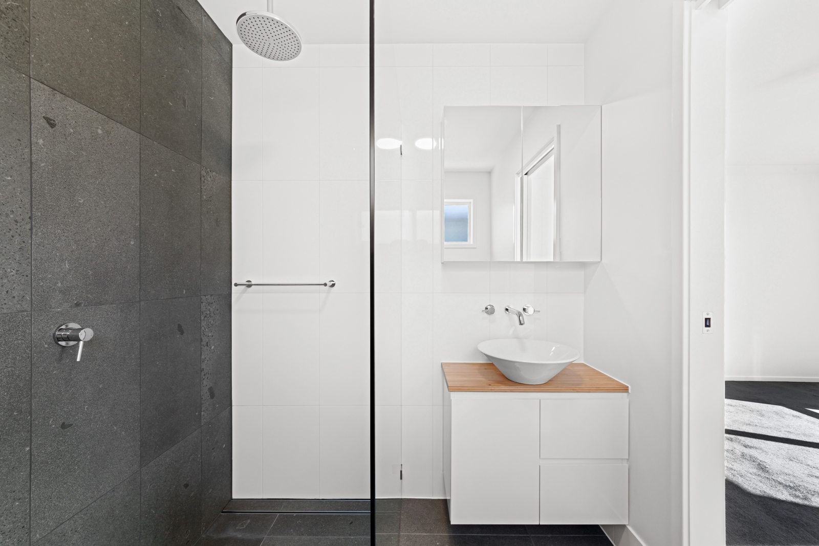 - Frameless shower panel with strip drain in the ensuite